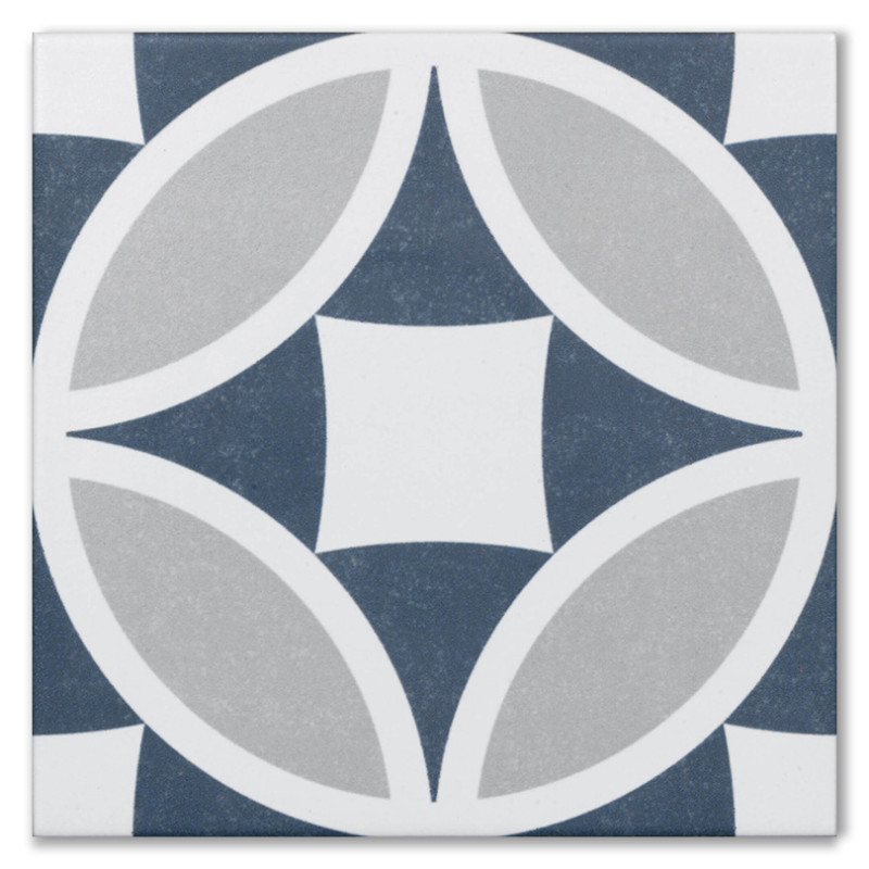 Transform your space with the Olympia Mix tile, featuring a captivating blend of white, blue, and grey in a striking patterned design; perfect for bringing a modern and artistic touch to your bathroom and kitchen floors and walls.